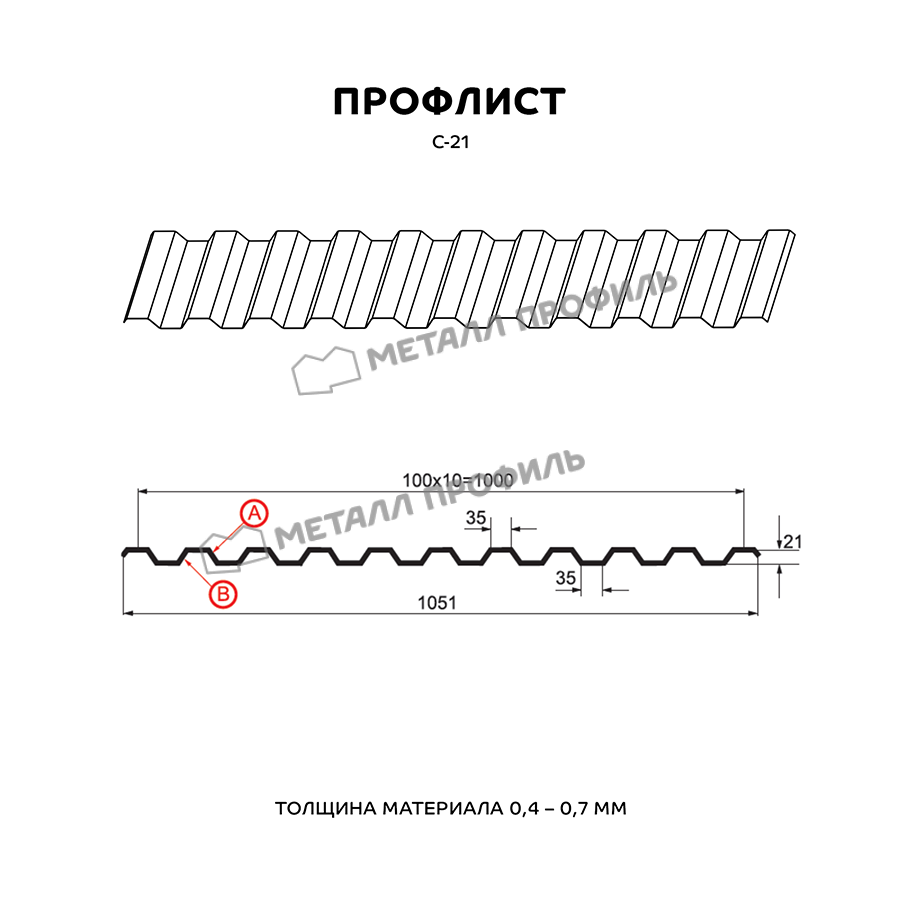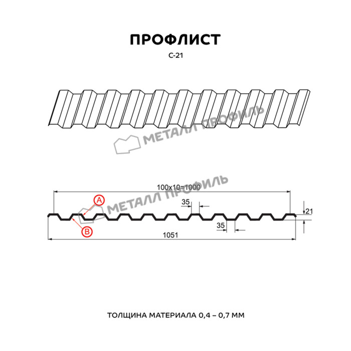 Профлист с маркировкой С-21 означает, что это «стеновой» вариант с глубиной профиля 21 мм. На самом деле, С-21 является универсальным материалом, который используется не только для фасадов. Он подойдёт как для обшивки стен, так и для обустройства кровли, установки заборов. Вполне успешно С-21 находит применение при создании быстровозводимых сооружений, складских помещений, торговых павильонов, а также в качестве элемента сэндвич-панелей. С-21 отлично подходит в качестве основы для Профилированного листа. Этому способствует его хорошая несущая способность. Довольно близко расположенные трапециевидные волны обеспечивают ему необходимую жёсткость. А пропорциональный рисунок гофры, идентичный с обеих сторон, придаёт Профилированному листу эстетичный внешний вид. В зависимости от назначения, мы изготовим профнастил С-21 в различной толщине стали от 0,4 до 0,7 мм. Для увеличения срока службы и внешней привлекательности, профлист изготавливается в полимерных покрытиях различных цветов и текстур, включая покрытия под кирпич, камень, дерево.
